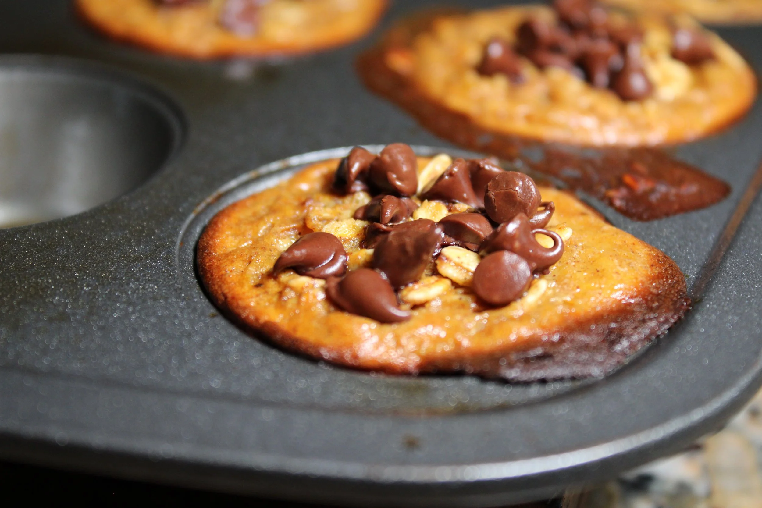 Divide batter into muffin tins, fill to the top and bake for 10 minutes. Pull out and garnish with chocolate chips, resume baking for another 15 minutes.