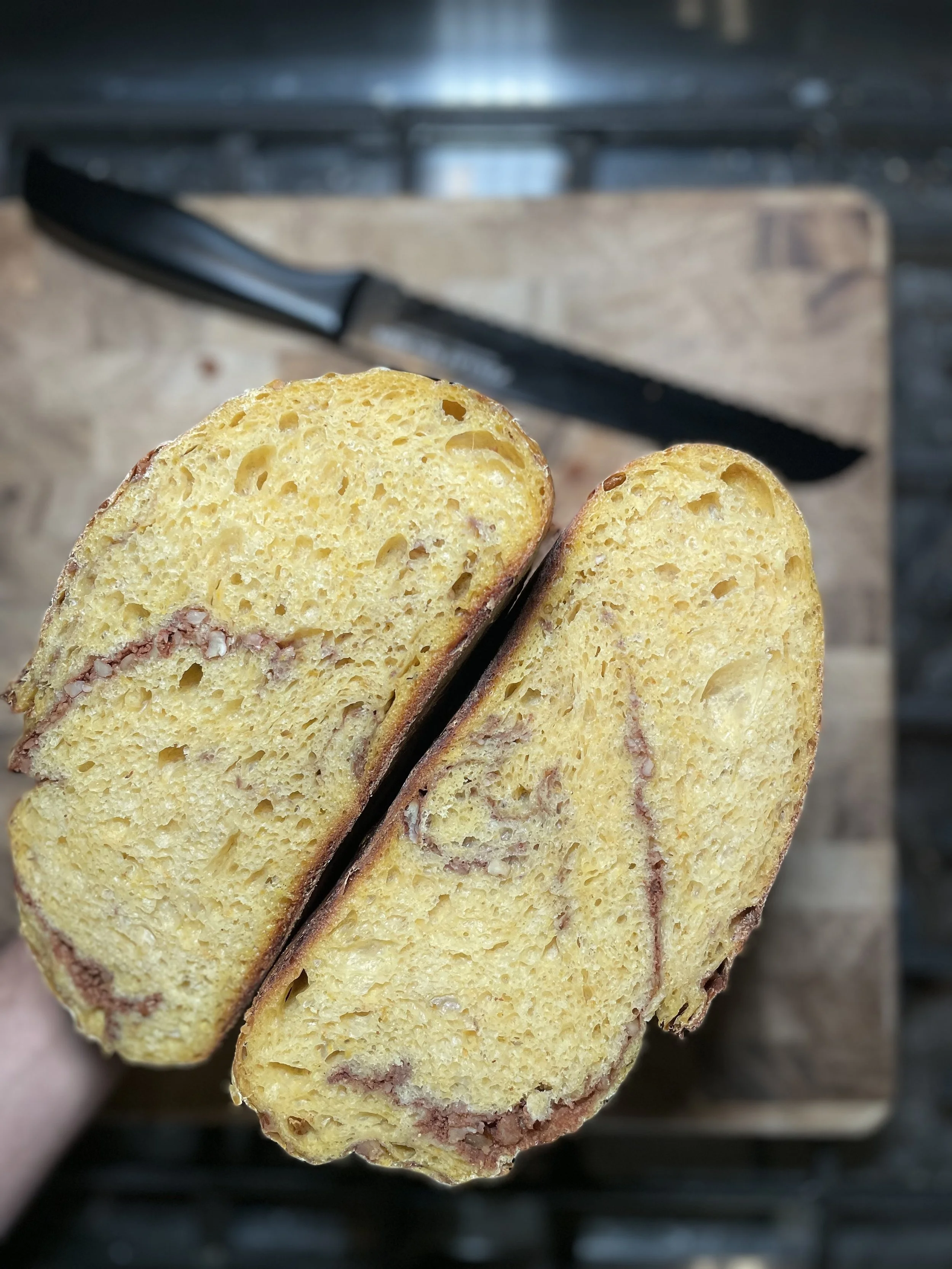 In a large mixing bowl add starter and pumpkin puree to water and stir together until well combined. Add flour and sea salt and combine until your dough reaches a shaggy consistency, cover with cling wrap and let sit for 1 hour ( autolizing )
